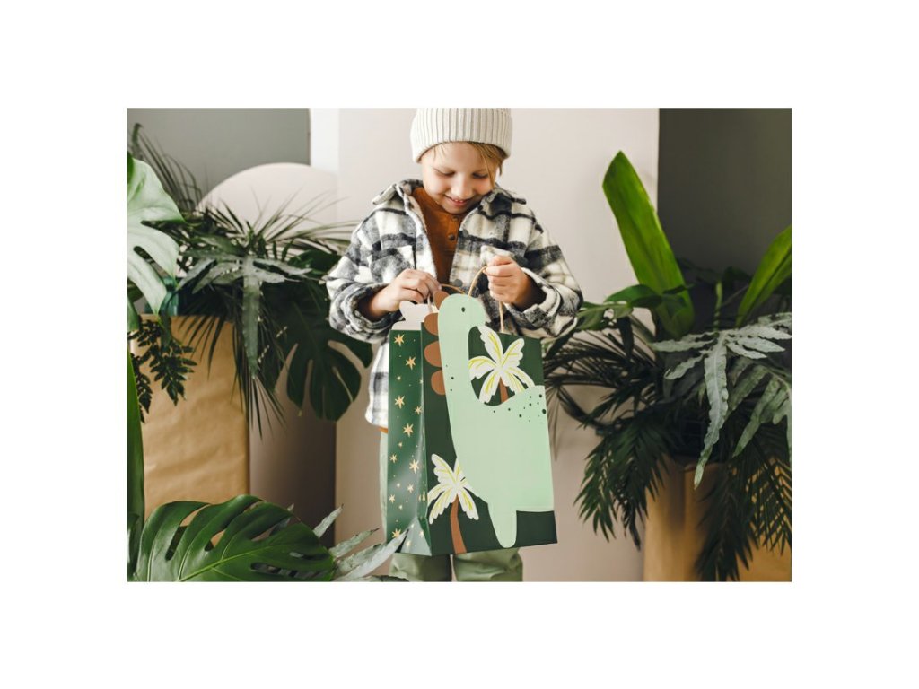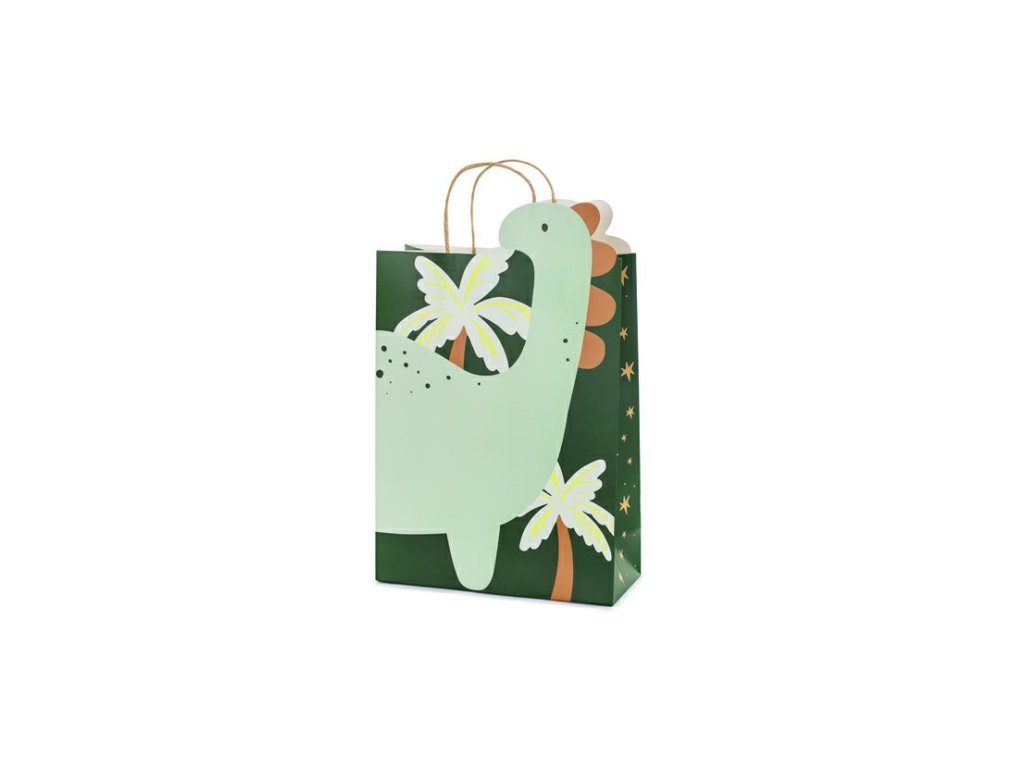 Praktická papírová dárková taška s motivem dinosaurů je skvělou volbou, když chcete darovat dárek bez nutnosti složitého balicího papíru. Veselý potisk pravěkých ještěrů dodá dárku originální vzhled a udělá radost zejména dětem či fanouškům dinosaurů. Taška je dostatečně velká pro různé druhy dárků a díky pevné papírové konstrukci zvládne bezpečně přenést i těžší obsah.