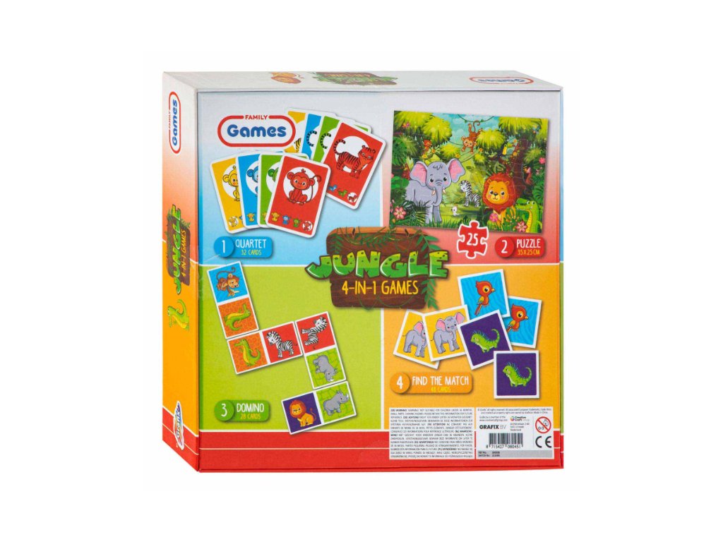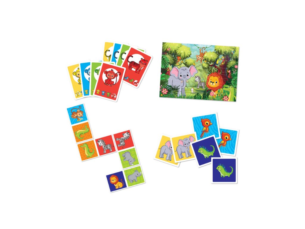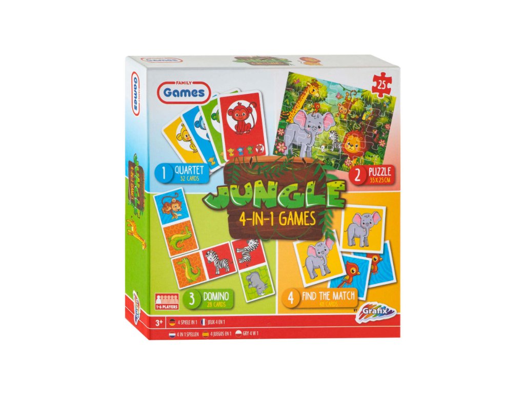 Herní sada 4v1 s motivem džungle přináší dětem hned několik oblíbených her v jednom balení. Box obsahuje čtveřici klasických her – kvarteto, puzzle, domino a pexeso – které zabaví děti doma i na cestách a zároveň podporují jejich rozvoj hravou formou.