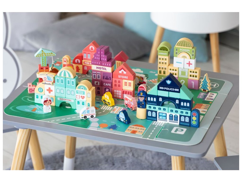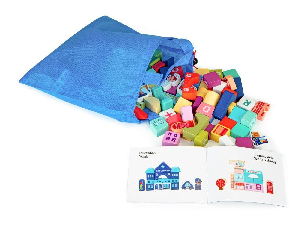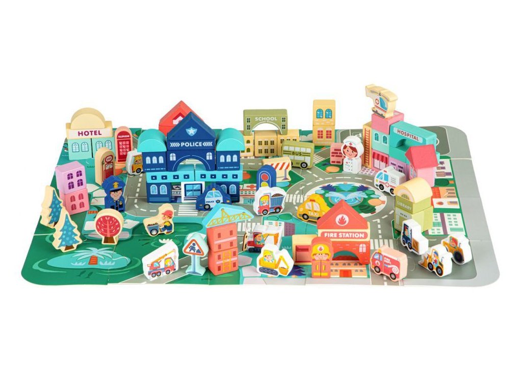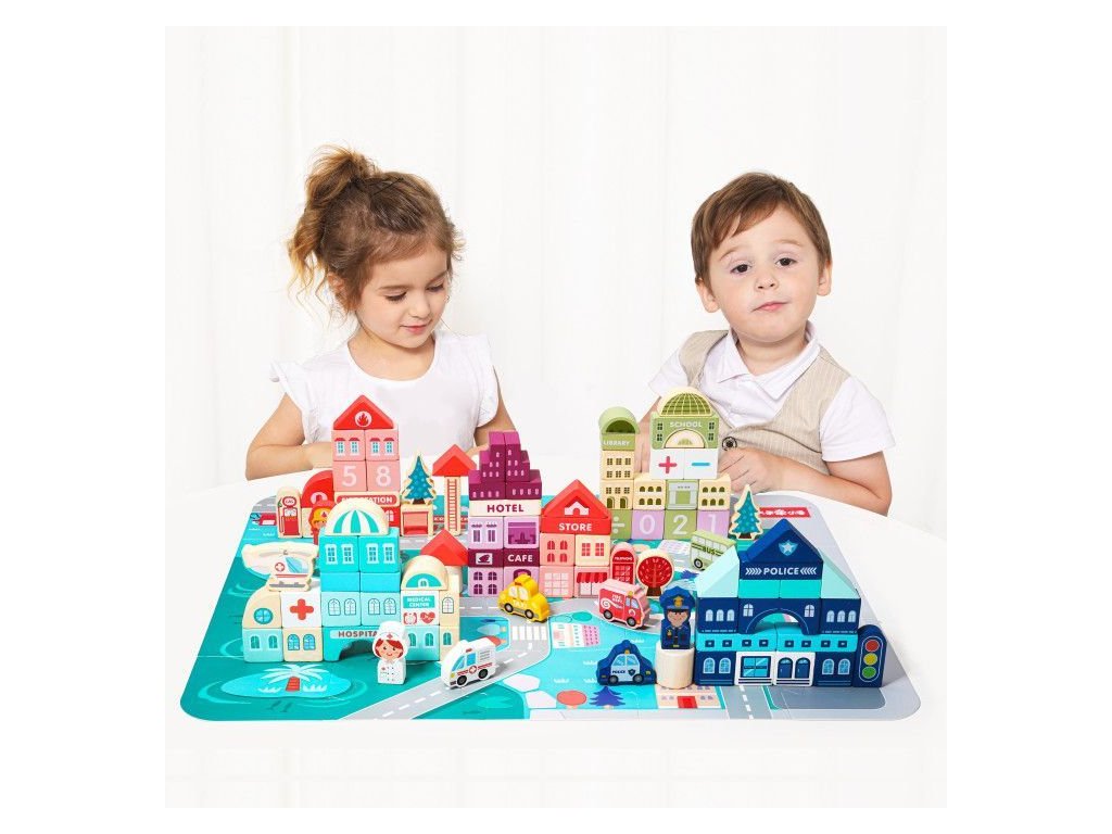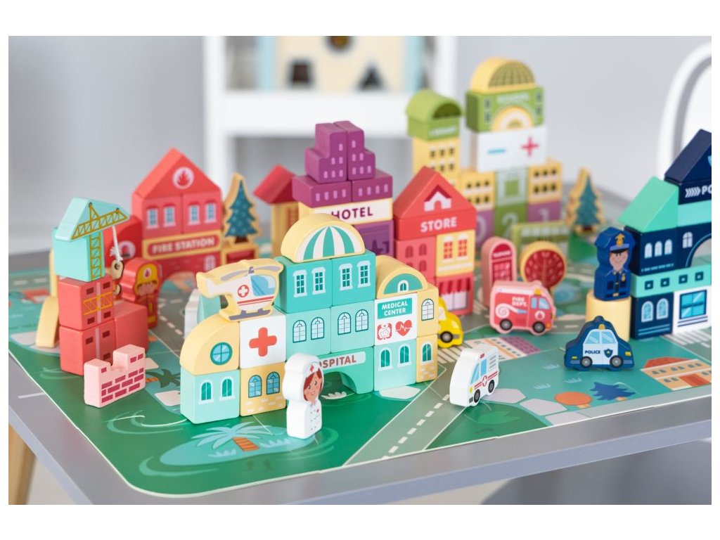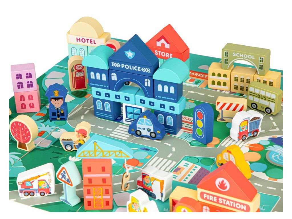 Děti si mohou postavit celé město, poznávat budovy a vozidla. Kostky rozvíjí jemnou motoriku i prostorové vnímání.