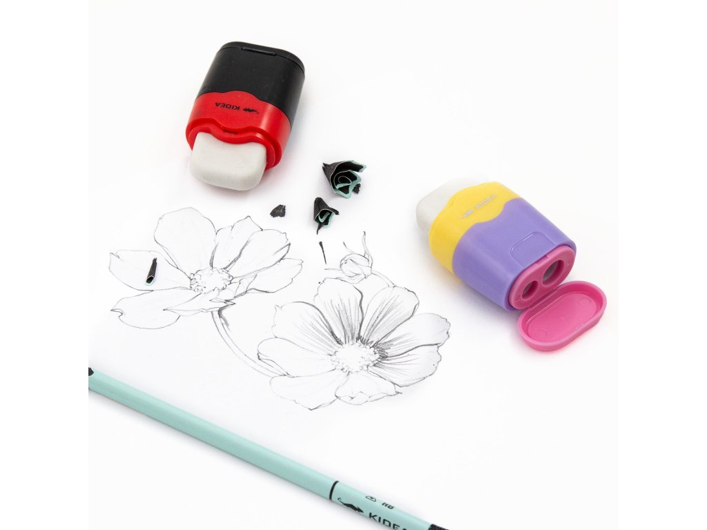Tohle strouhátko je dokonalý pomocník do penálu i designový doplněk! Díky dvěma otvorům si poradí s klasickými i silnějšími pastelkami (Jumbo). Na druhé straně najdeš jemnou gumu zabalenou v bezpečné plastové ochraně – vše je na dosah, bez zbytečného hledání. Podložené dno opatřeno zásobníkem na třísky pomůže udržet pořádek i během výtvarných prací. Lehké plastové tělo se drží pohodlně a funguje na jedničku i pro menší ručky.