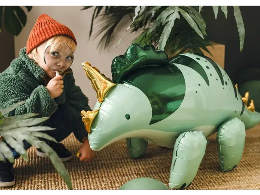 Fóliový balónek Dino Triceratops přinese na party hravý motiv pravěkých dob a dětskou radost. Je to krásný doplněk na narozeninové oslavy, tematické akce s dinosauří tématikou nebo jen tak pro dekoraci v dětském pokoji.