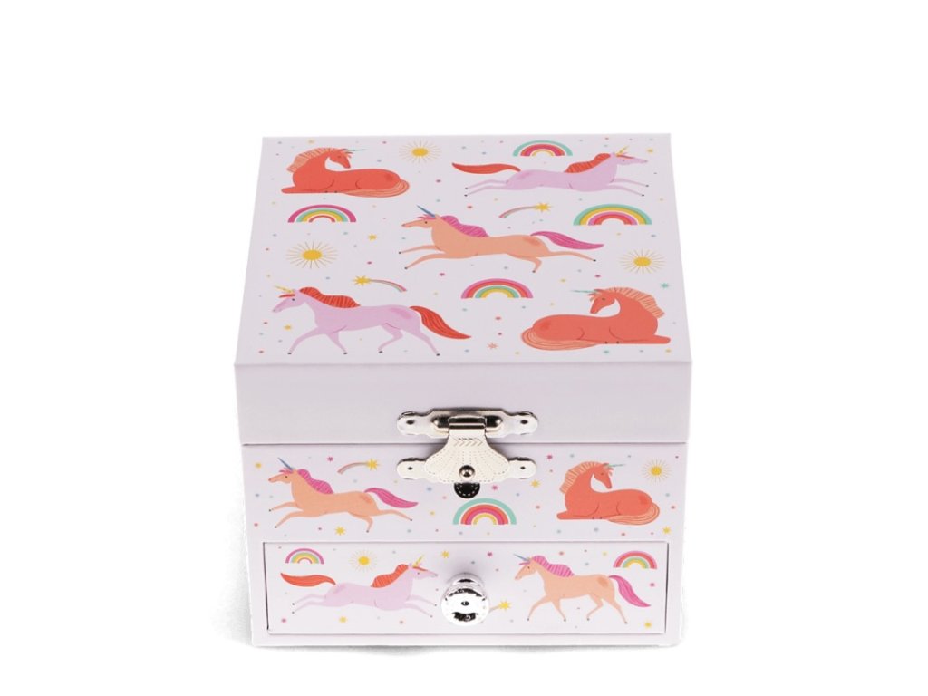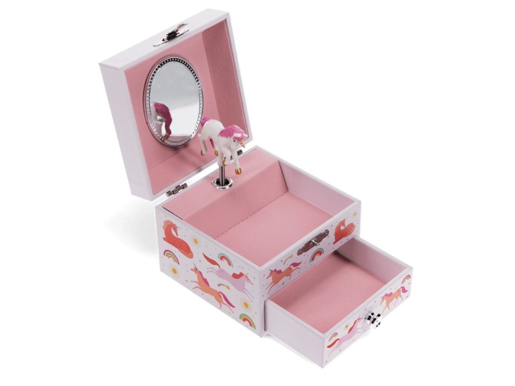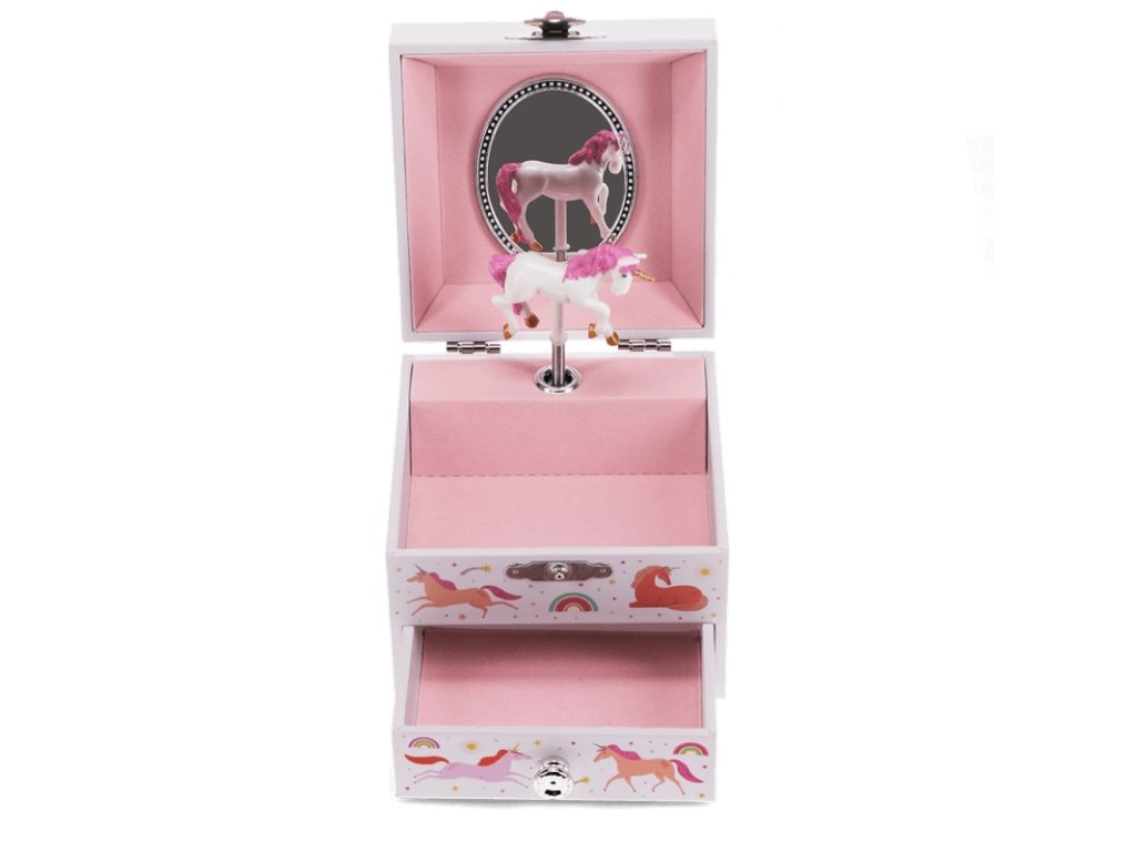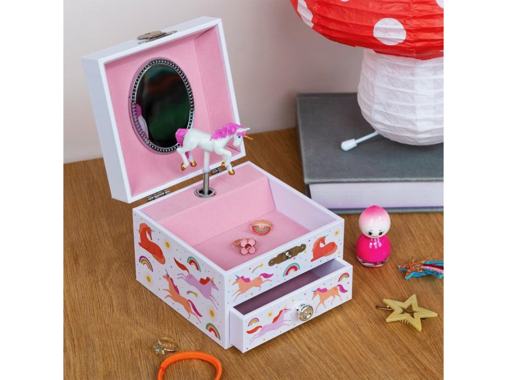 Tuto šperkovnici si děti zamilují hned, jak otevřou víčko – jednorožec uvnitř začne kouzelně tančit za doprovodu klasické Beethovenovy Zum Für Elise. V zrcátku uvnitř najdou svůj úsměv, šuplíček pojme první poklady, a hodící ruční navíjení dozadu je báječně staromódní. vše je pevné, hezky různorodé a krásně nostalgické.