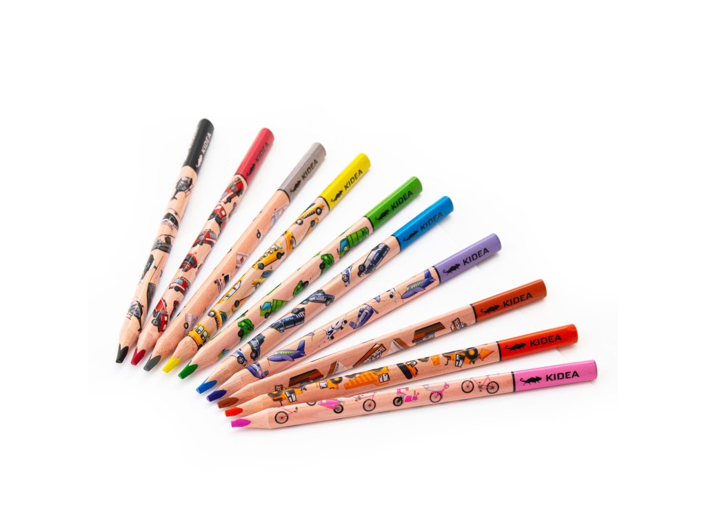 Na silnici tvořivosti čeká opravdová jízda! Tyto široké trojhranné pastelky od KIDEA mají ergonomický tvar, který napomáhá správnému úchopu a zabraňuje kutálení ze stolu. Každá z 10 pastelek je ozdobena realistickou grafikou vozidel – čeká tu auto, letadlo, náklaďák a další, aby tvoření bylo ještě víc zábavné. Měkká, hladká tuha je skvělá na pokrytí velkých ploch i precizní tahy, a jejich pestré odstíny rozsvítí letáky, obrázky i domácí úkoly.