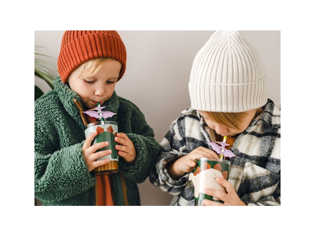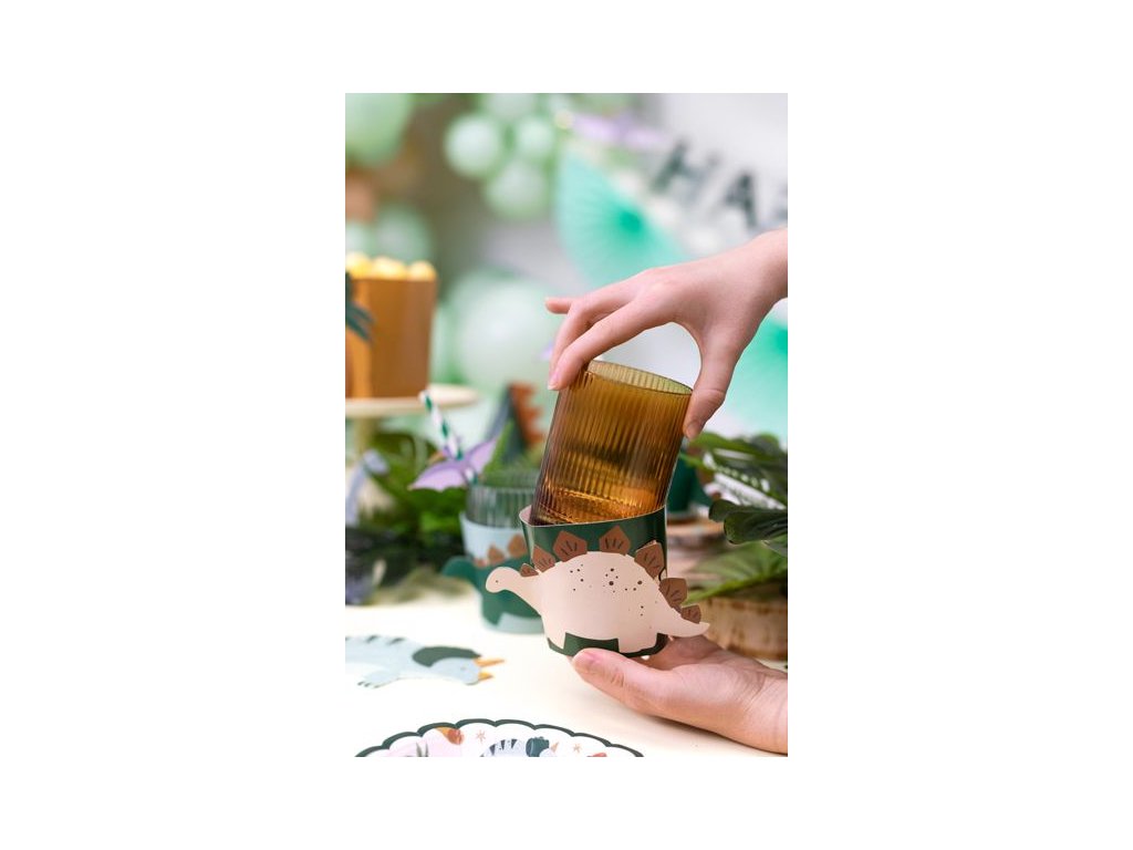 Návleky na skleničky a hrníčky s motivem Dino jsou snadno použitelné a promění obyčejné papírové kelímky nebo hrníčky v součást tematického stolování bez složité výzdoby. Barvy a tvary motivů lze krásně kombinovat s dalšími dekoracemi se stejným motivem a vytvořit tak celkově sjednocenou party tabuli, která působí veselým a hravým dojmem.