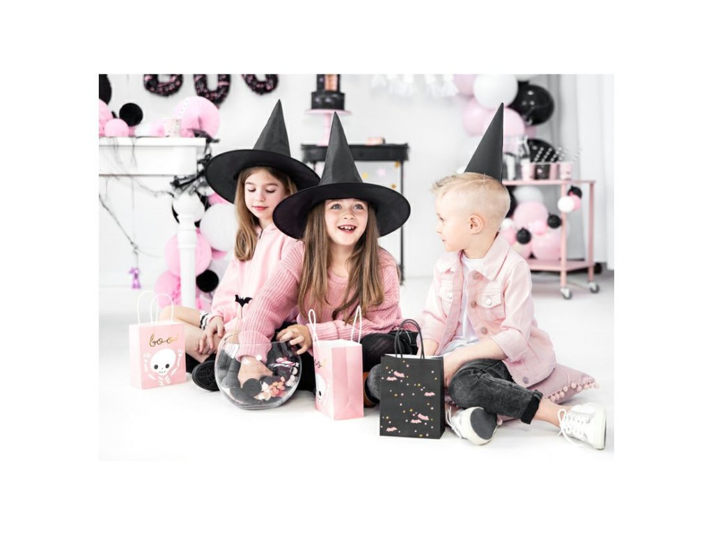 Černý čarodějnický klobouk, který je ideálním doplňkem ke kostýmu čarodějnice. Vhodný na Halloween, pálení čarodějnic, karneval i tematické večírky.