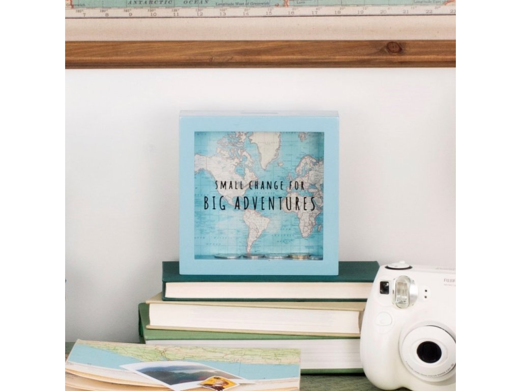 Tato pokladnička od britské značky Sass & Belle je nejen praktická, ale i stylová. Vyrobena z kvalitního MDF dřeva a skla, nabízí prosklenou přední stranu, která umožňuje sledovat, jak se vaše úspory zvyšují. Nápis „Small Change for Big Adventures“ a vintage mapa světa dodávají pokladničce unikátní a dobrodružný vzhled. Otvor na vrchní straně je určen pro vhazování mincí a bankovek, zatímco zadní strana se snadno otevírá, takže své úspory můžete vybrat bez nutnosti rozbíjení pokladničky. Perfektní pro všechny, kteří sní o cestování a chtějí začít šetřit stylově.