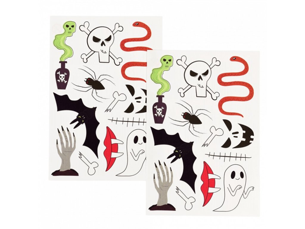 Tetovačky, které se snadno promění v malé dárkové překvapení. Chuť na trochu strašidelného potěšení? Jednoduše si vyber motiv, potřete vodou a sledujte, jak se na kůži zjeví netopýr, kostlivá ruka nebo záhadný duch. Díky dvěma archům s různými velikostmi obrázků se dají kombinovat, vyměňovat a doplňovat podle nálady. Díky lehkému a zábavnému použití se skvěle hodí jako doplněk na halloweenské oslavy, dýňové slavnosti nebo nečekané párty v rouše… no dobře, kostýmu.