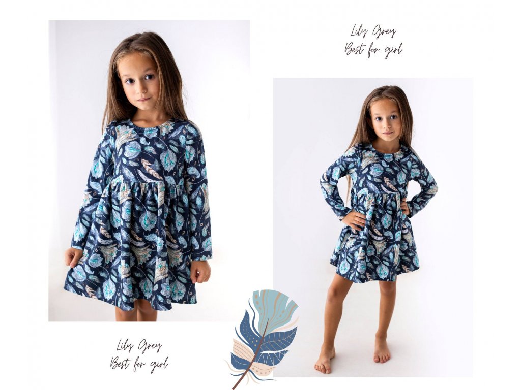 Tmavě modrý podklad doplňují jemná pírka v odstínech tyrkysu a béžové, která dodávají šatům kouzelný nádech.