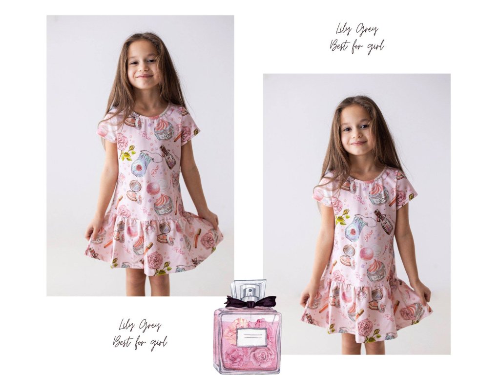 Tyto růžové šatičky zdobí originální potisk parfémků, rtěnek a růží, který potěší každou malou parádnici.