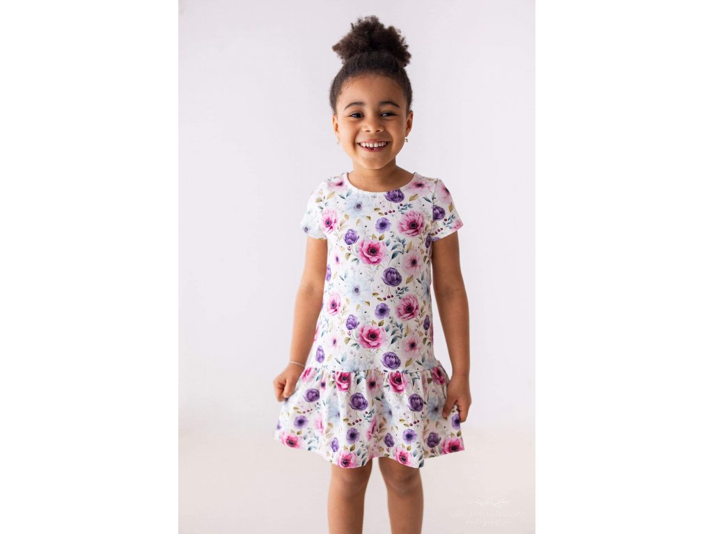 Světlý základ s růžovo-fialovými květy působí svěže a rozzáří každou malou slečnu.