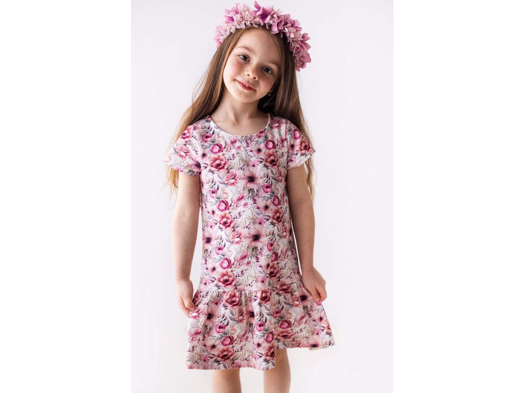 Jemný květinový vzor v odstínech růžové a pudrové dodává šatičkám romantický nádech, který rozzáří každou malou parádnici.