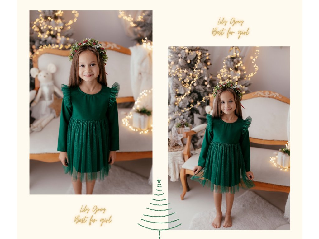 Smaragdově zelený živůtek působí slavnostně, zatímco tylová sukně s jemným třpytem dodává šatům pohádkový nádech.