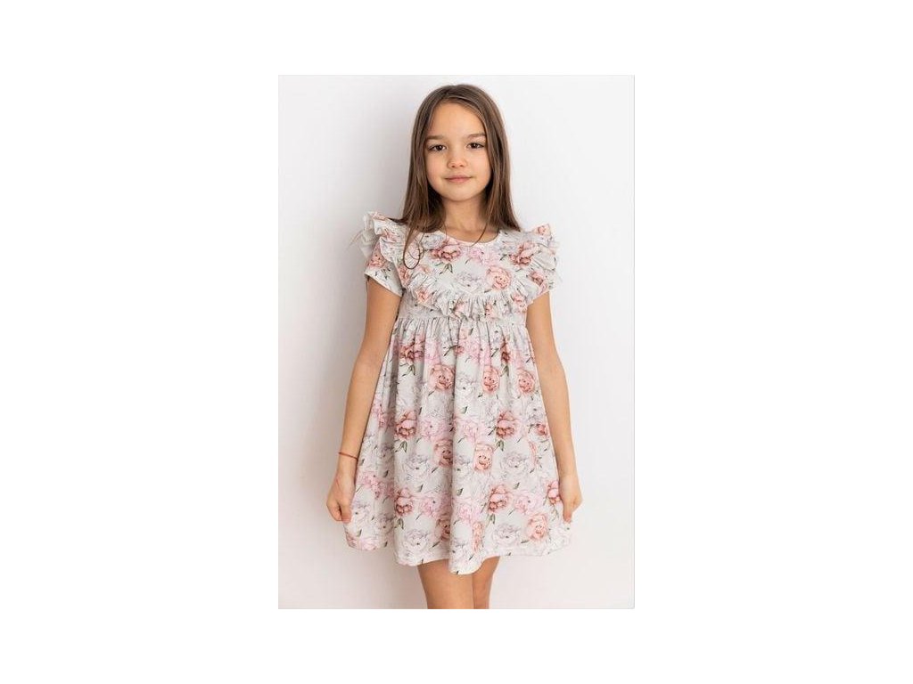 Světlý základ s jemnými květy působí jako malovaný akvarel, zatímco volánky kolem ramen dodávají dívčí půvab a špetku roztomilosti.