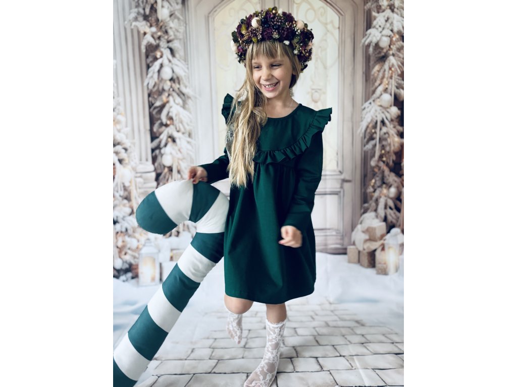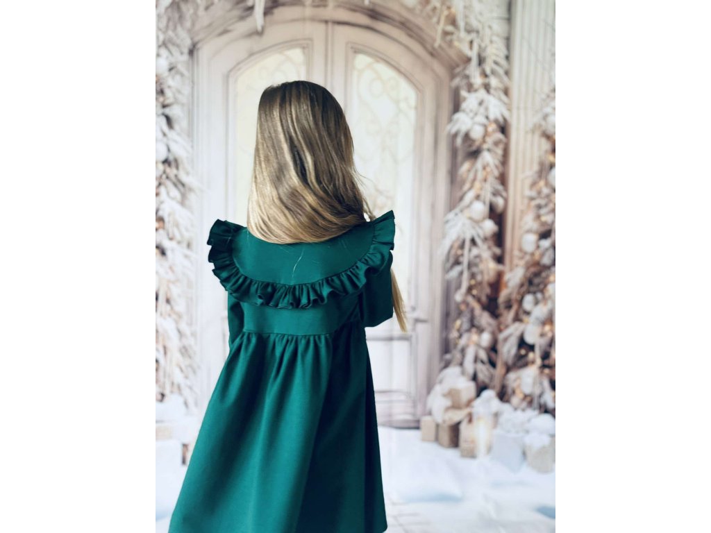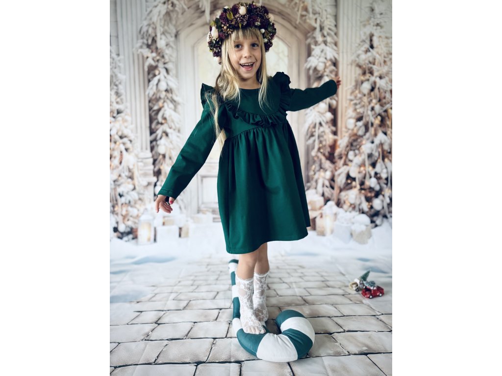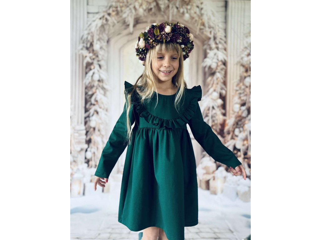Zelená barva dodává šatům hloubku a slavnostní nádech, zatímco volánky přes hrudník a ramena přidávají jemnost a pohyb.