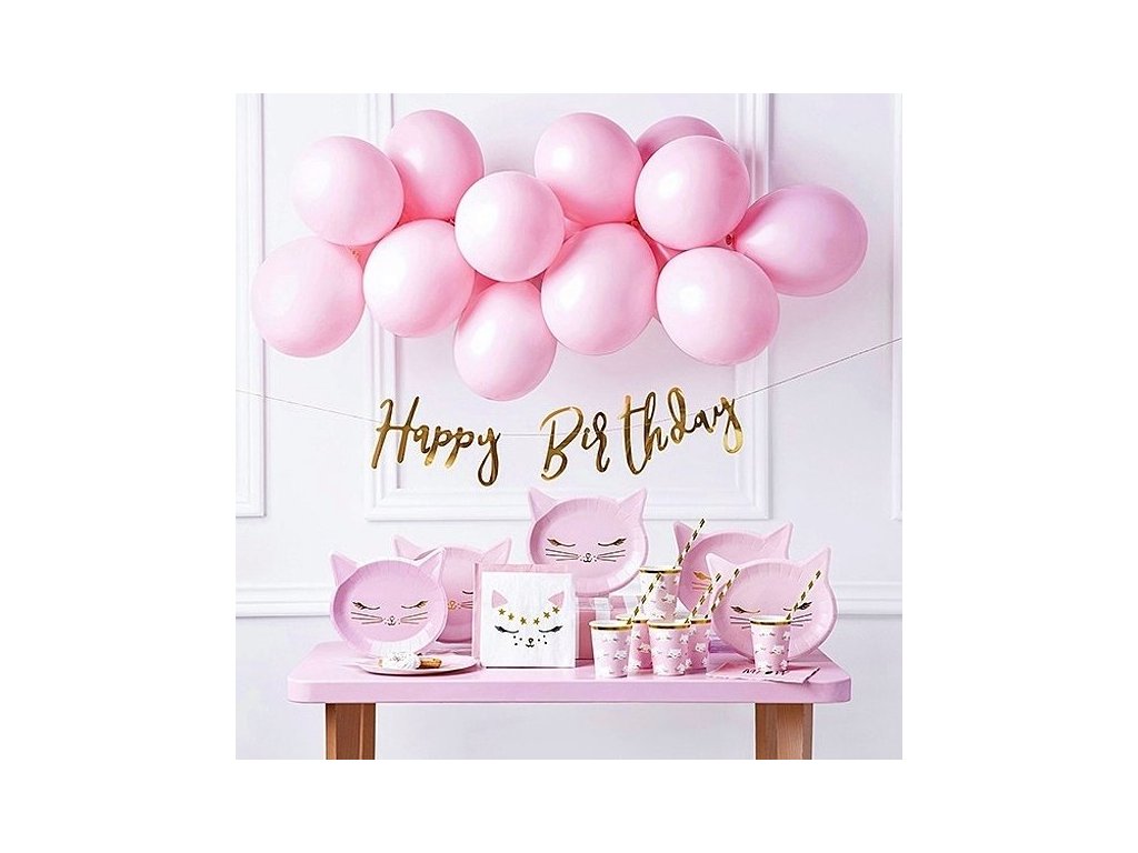 Sada narozeninových dekorací Kočka obsahuje: 1x banner s nápisem Happy Birthday, 6 x jednorázové papírové kelímky, 6 x jednorázové papírové talíře, 10 x papírová brčka se zlatými proužky, 20 x papírové ubrousky a 12 ks jednobarevných světle růžových latexových balónků.