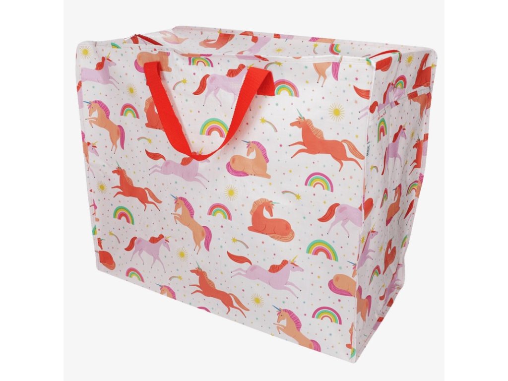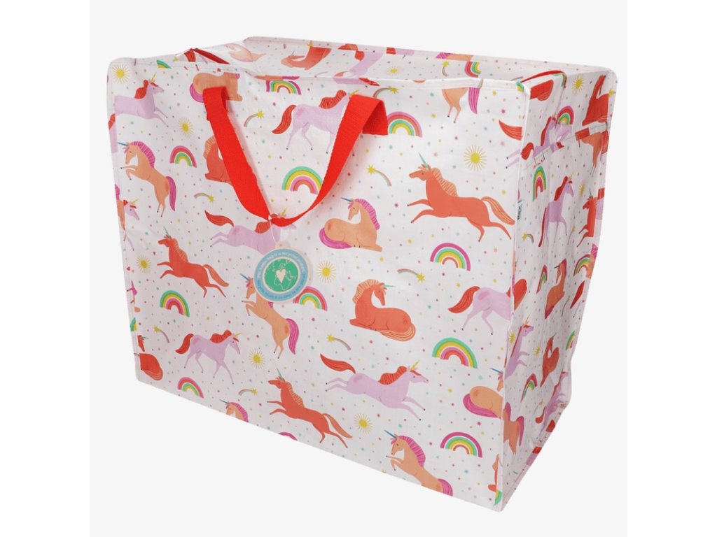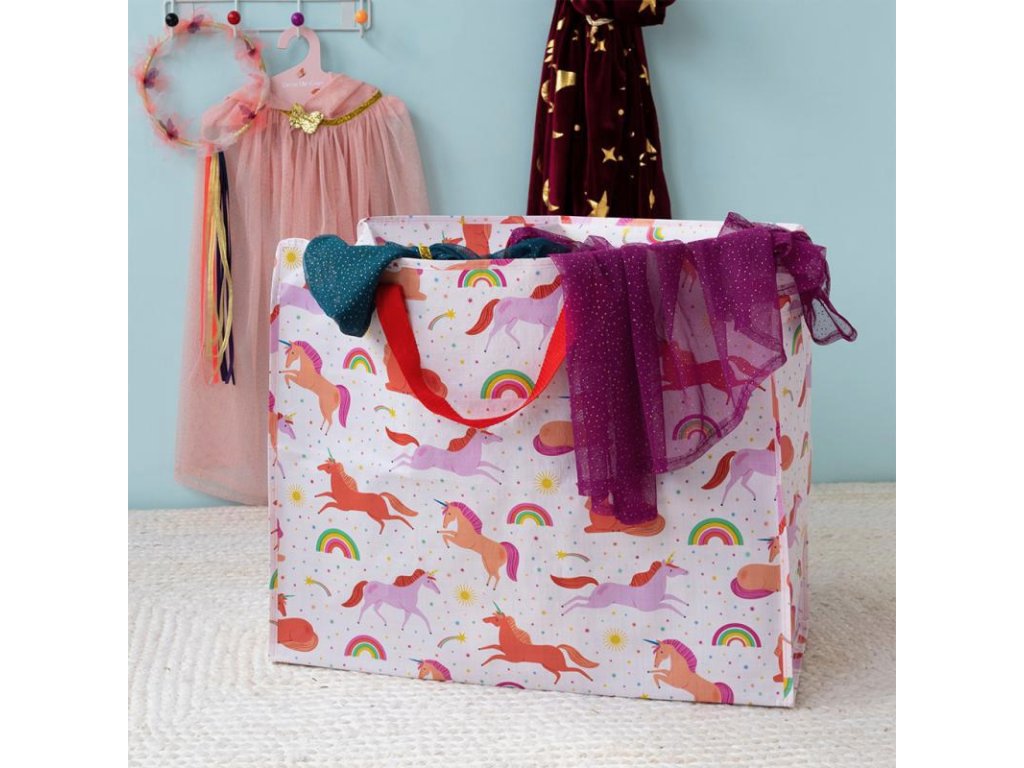Tato velká úložná taška od Rex London je nejen praktická, ale i kouzelně roztomilá. Motiv jednorožců na bílém pozadí s červenými ušima a zipem přináší do každého pokoje nádech pohádky. Vyrobena z recyklovaného plastu, nabízí objem 78 litrů, což je ideální pro uskladnění hraček, oblečení nebo jako taška na pláž. Díky pevným nylonovým uším se snadno přenáší a po použití ji lze složit do plochy pro úsporu místa.